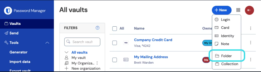 Tous les éléments dans tous les coffres. Les membres des organisations Les membres d’une organisation y verront également les coffres partagés. Grâce à la colonne Filtres, vous pouvez structurer vos données en utilisant les Favoris et les Dossiers.