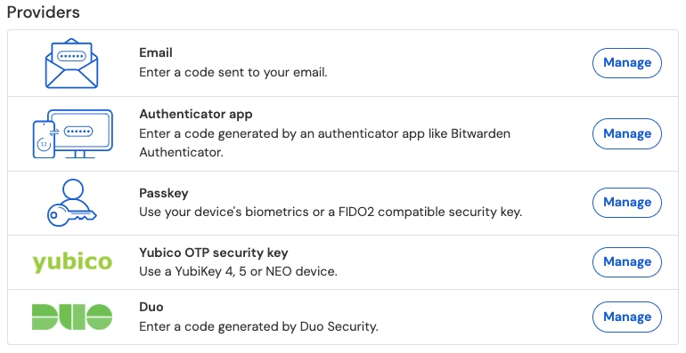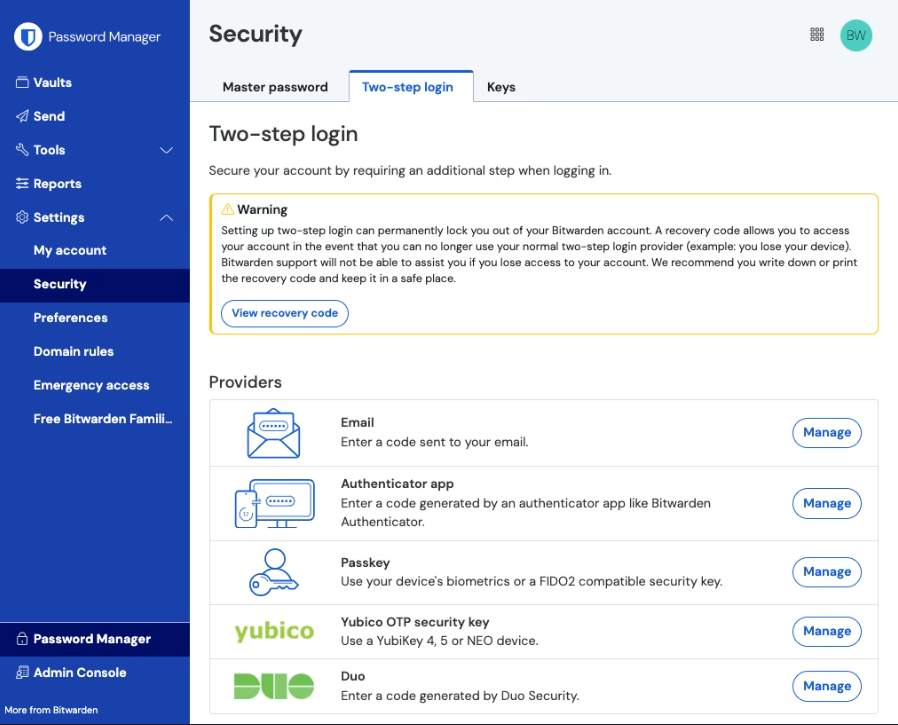 Dans l'application web Vaultwarden, ouvrez Paramètres → Sécurité → Identifiant en deux étapes.